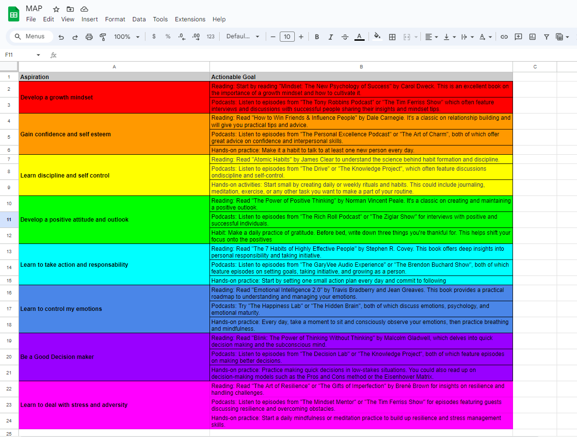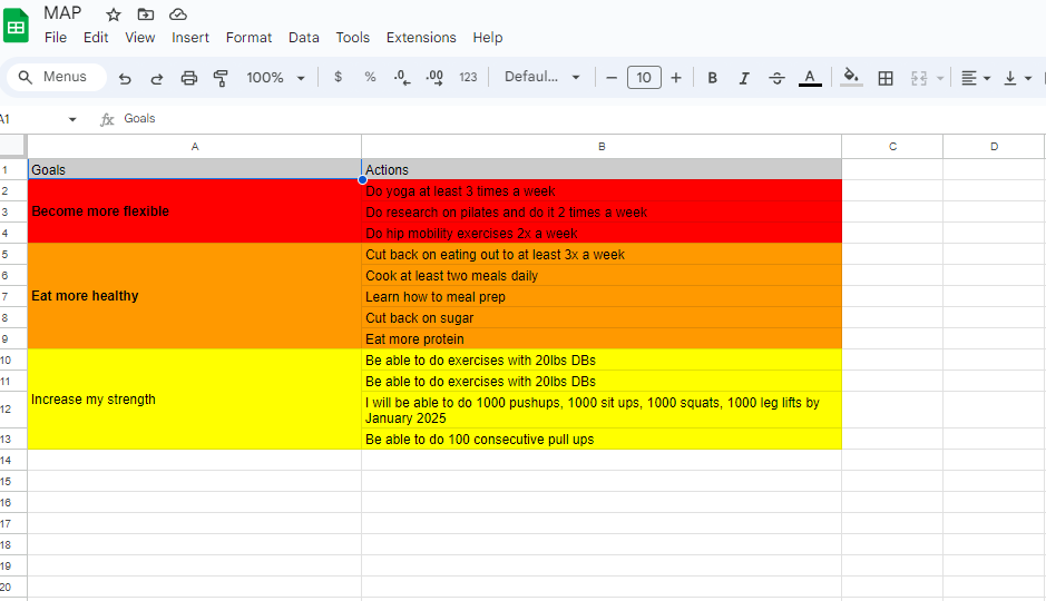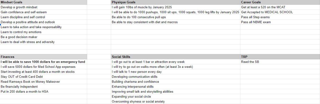 I borrowed this male action plan from the TRP space on reddit, so I want to give them a shout out to those guys. I made a rough outline of my aspirations and broke them down into different categories I needed work in. They consist of Mindset, Finances, Physique goals, Social skills, Career goals, and I even added the TRP as another category. So in order to make this even more efficient, I further broke down my aspirations and made them into actionable goals.